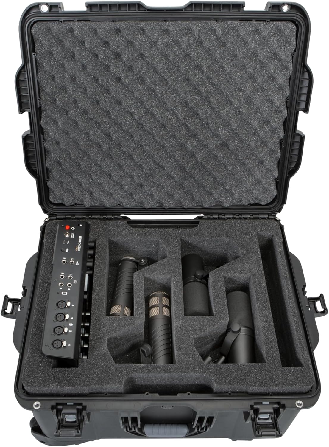 Gator’s Titan Series waterproof case is custom cut to provide a tight fit for the RODEcaster Pro Podcast Mixer and fits most headsets up to four in quantity & either four PodMics, Procaster Mics or Shure SM7B Mics. Built to ATA-300 certifications, the shell contains military-grade craftsmanship, making it the prime solution for traveling broadcasters and podcasters by protecting against the elements. Your gear is even further guarded with patented Powerclaw latches engineered specifically to keep the case closed during transport or in the event of a drop. Custom-cut foam inserts ensure a snug fit to help secure the mixer and microphones when being moved around. A soft-grip carry handle promotes comfortable transport. Storage for a power supply, microphone cables & other accessories is also provided. For the valuable gear you love most and depend on, why risk it? Protect your investment with the Titan Series by Gator Cases.
