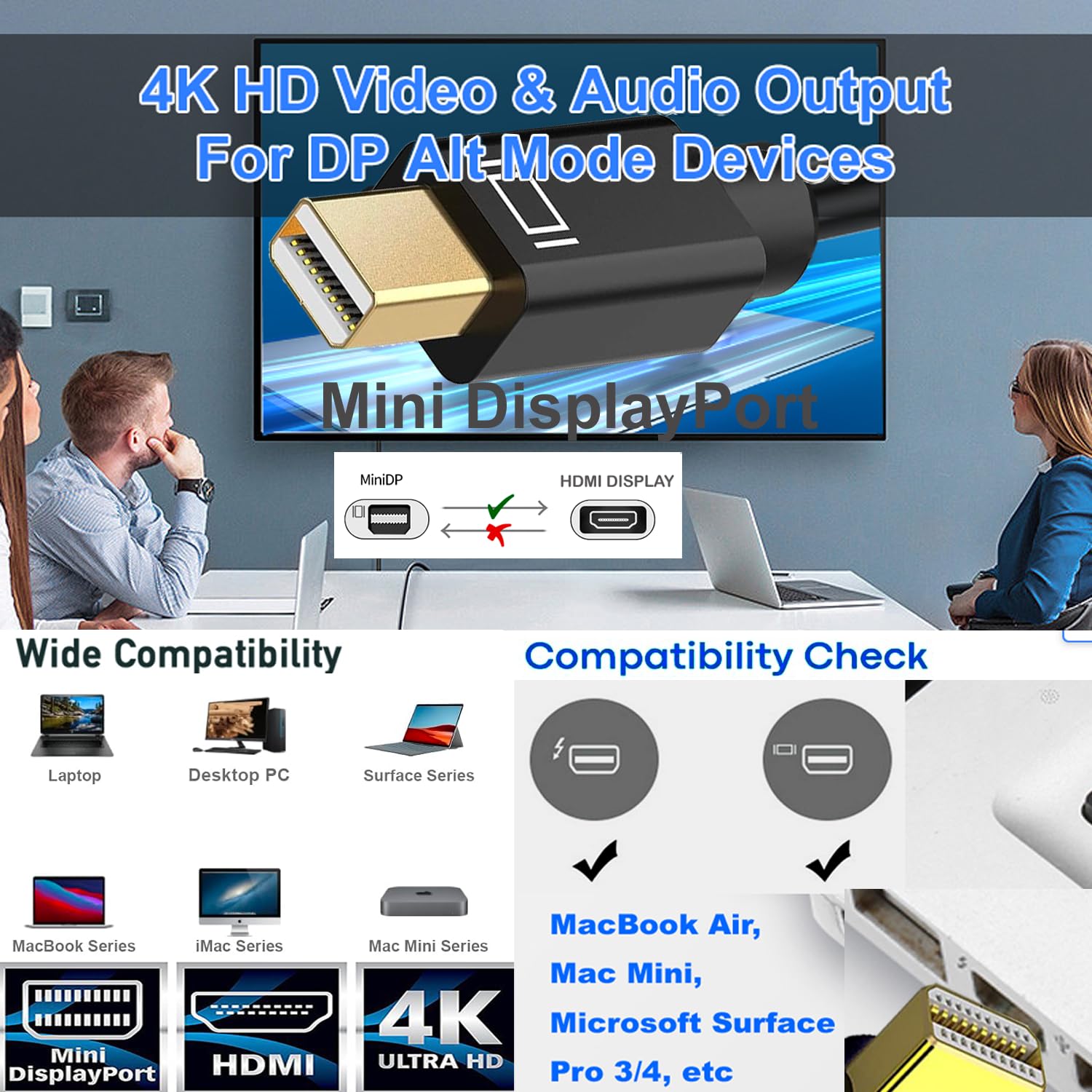 Supports HDMI resolution up to 4k*2K@30Hz 1. In order to enjoy the 4K high resolution, please make sure to HDMI 4K cable 2. We recommend you to make sure your monitor or TV could supply corresponding output. that means if your computer supports 4K@30Hz, while your monitor or TV only supports 1080p, you can only output 1080p rather than 4K.Note: for 4K usage, it requires device to support only 4K/30Hz, not 60Hz. refer to your device manual. Supports resolutions up to 4K x 2K, and flawless audio pass-thru for uncompressed digital 7.1, 5.1 or 2 channelsThis cable is not bidirectional, it only supports converting signals from Mini DP to HDMI