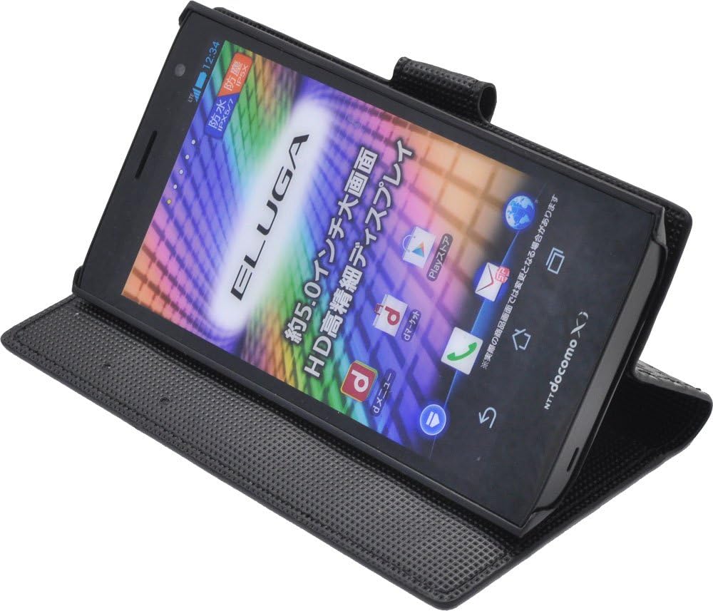 Checkered Leather Design Stand Case Pouch for ELUGA power P-07D Protects ELUGA power P-07D from impact and scratches. In addition, the interior is equipped with a plastic case to keep the unit firmly in place. Back folds back to use as a stand for convenient video viewing. Comes with a strap hole that is perfect for preventing falls. Since it opens horizontally, you can use it like a notebook. It also has two interior card pockets and a side pocket. ELUGA power P-07D not included. This is not a licensed product. *Cards are not included.