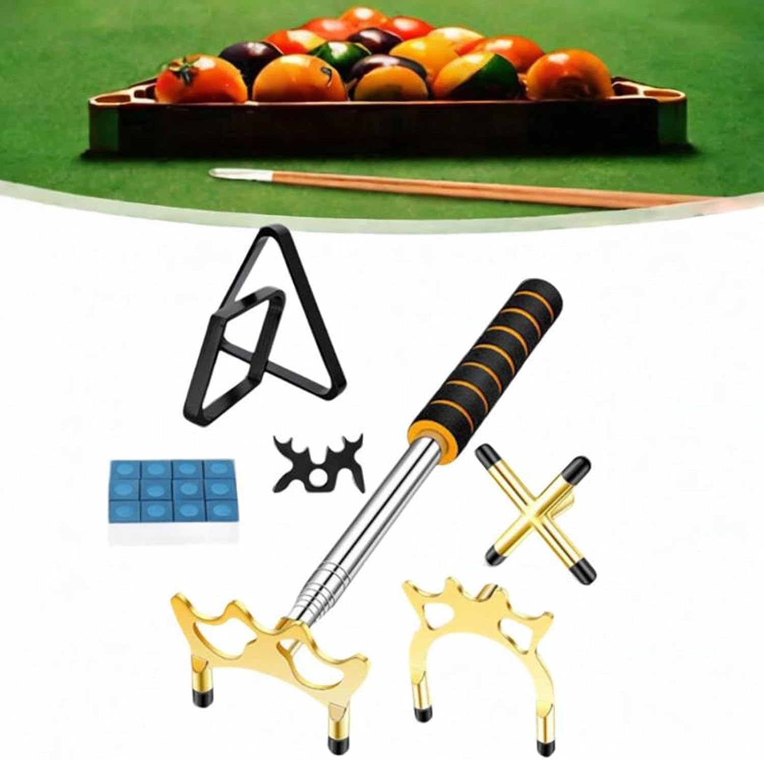 Description: - 【Versatile Pool Cue Stand】: Retractable Billiards Cue Stick Bridge with 4 Pieces Removable Bridge Head is specially designed for assisting you to have a good angle or position for hitting. - 【Premium Material】: Pool Cue Snooker Pool Bridge Stick Pool Table Accessories are made from quality matal, that ensures longevity and maintains the quality of your game. - 【Adjustable Size】: The product size can be adjusted from 35cm to 160cm, making it suitable for various sizes of pool cues and space. - 【Comprehensive Billiard Accessory Set】: Each package comes with 1 Retractable Pool Bridge Stick, 4 Removable Bridge Heads, 1 Triangle Rack, 1 Rhombus Rack, 12 Pool Cue Chalks, adding and functionality to your game room or bar area. - 【Application】: The Retractable Billiards Pool Cue Stick Bridge with 4 Pieces Bridge Head Billiards Pool Accessories Set is widely suitable for most billiard cues, appropriate for using at home, party, billiard club, and other occasions.Size Chart:35cm-160cm/13.78inch-62.99inchPackage Includes:1 Retractable Pool Bridge Stick4 Removable Bridge Heads2 Pool Table Racks(1 Triangle Rack and 1 Rhombus Rack)12 Pool Cue ChalksNote:Please allow slightly errors 1-2cm differences due to manual measurement.