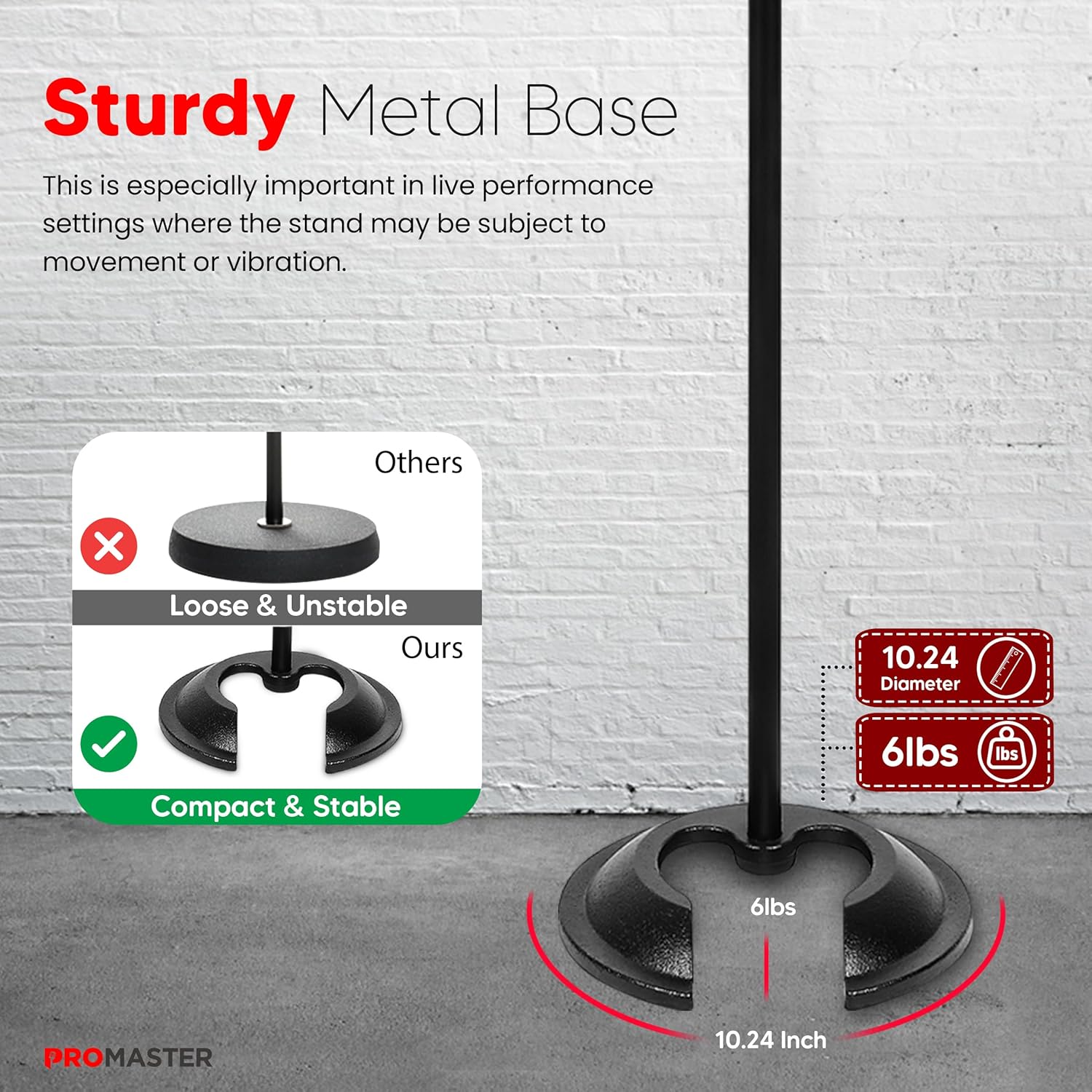 Elevate your audio experience with the ProMaster Universal Mic Mount, designed for stability and versatility. Its heavy, compact base ensures premium stability, keeping your microphone secure during performances and recordings. Customize your setup effortlessly with quick height adjustments ranging from 33.46" to 61", ensuring optimal positioning for an exceptional sound experience. Crafted from durable steel with a powder-coated finish, this Mic Mount is built to withstand professional demands, guaranteeing longevity and reliability in various environments. The compact design enhances stability and portability, making it easy to take your ProMaster Mic Mount wherever your musical or recording journey leads. Count on the sturdy base for unwavering support, allowing you to focus on your craft without concerns about equipment mishaps. Upgrade your audio setup with ProMaster, where precision engineering meets seamless performance and reliability.