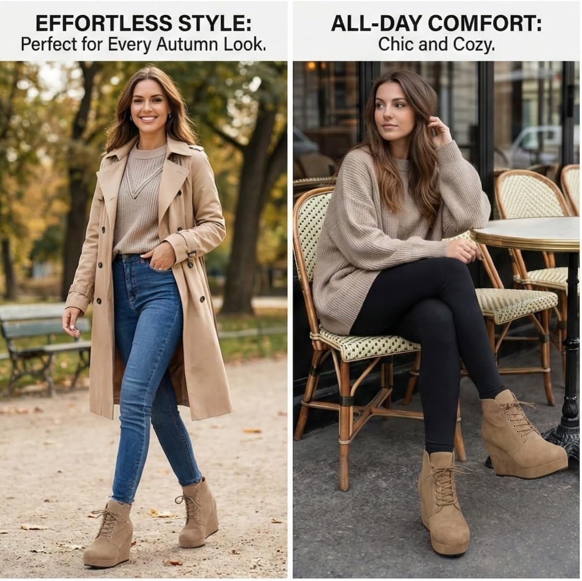 Step out in confidence and style with these versatile suede wedge ankle boots. Designed for the modern woman who desires both height and practicality, these booties feature a cleverly concealed internal wedge heel supported by a substantial platform. This innovative design offers the flattering silhouette of a high heel but with considerably more stability and comfort, making them suitable for all-day walking. The exterior is finished with a soft, high-quality faux suede, giving the boots a premium look and feel. The traditional lace-up front not only ensures a snug, adjustable fit but also adds a timeless fashion element. Finished with a durable, non-slip rubber sole for reliable traction, these wedge booties are the perfect addition to your cool-weather wardrobe, easily complementing everything from casual denim to dressier ensembles.